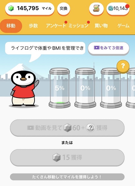 マイル獲得方法は2種類あり、CM動画を見ると60マイル、ボタンを押すだけでもらえるのが15マイルとなっています。動画を見ても大丈夫な環境にいる時は積極的にCM動画を見ましょう。15マイルもらうのは外で通信容量や電池残量が気になる時だけにしておくのが無難です。