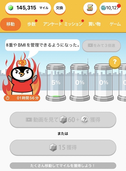 移動での動画後の獲得マイルは100マイルだったし、歩数はローラースケートと同じ効果のある3時間有効の動画視聴ボタンがあったし。悪いことが続くとガチャやスロットの当選確率も下がったのではと邪推しちゃうよね。