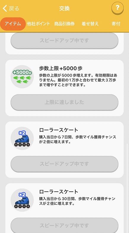 ここで交換できるローラースケートが1000歩に1度だったものを500歩に1度に変更できるアイテムとなっています。歩数での効率がこれだけで2倍となるんです。常に使い続けるようにする為、30日間の交換分(2000マイル)は残しておくようにしましょう。交換したマイルは直ぐに取り戻せるでしょう。